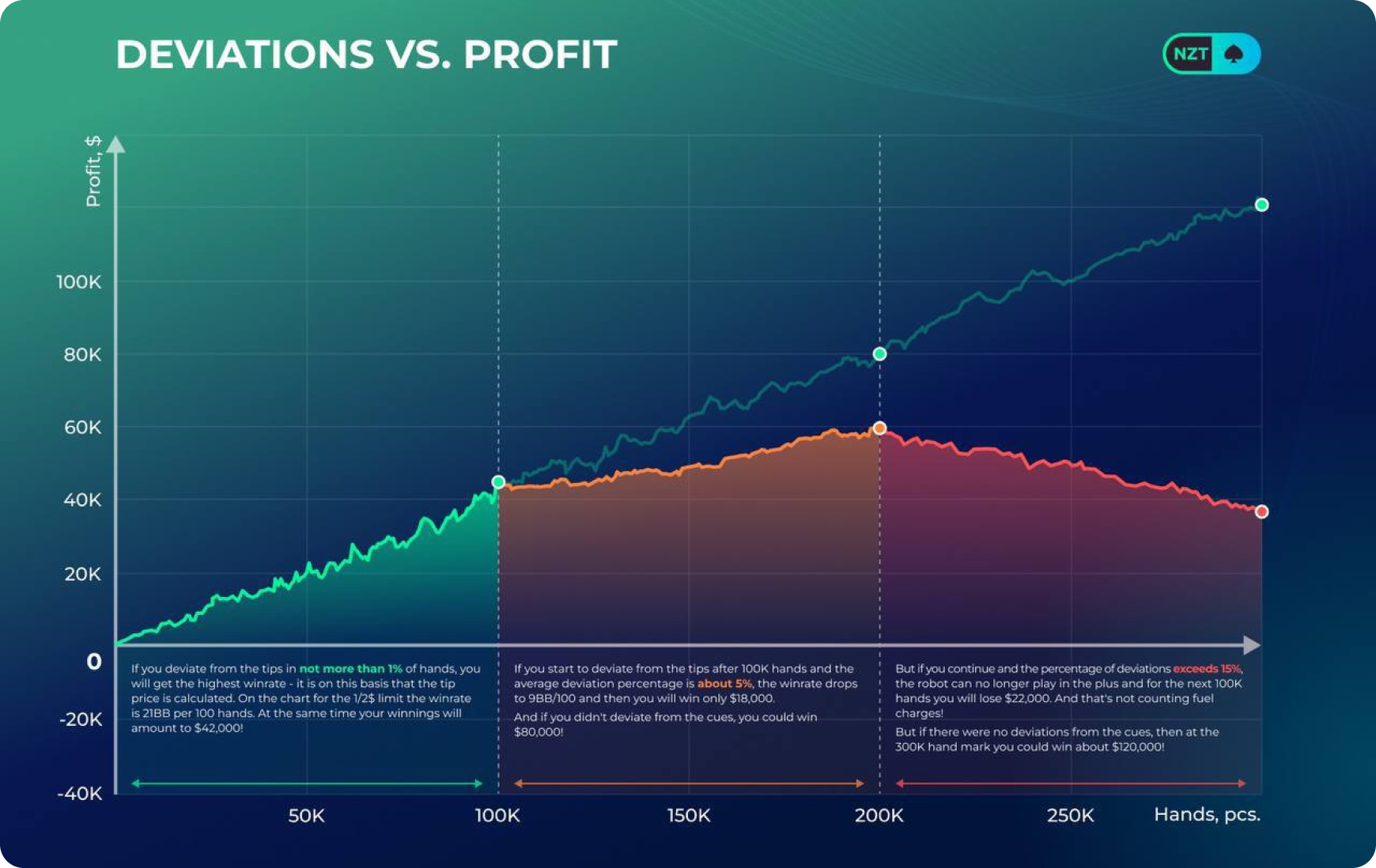 Will NZT Poker guarantee no losses after buying a coupon? No one can promise that in poker. Success with our poker helper depends on hands played and following real-time poker tips. Stick to the poker ai hints, and you’ll hit over 10bb/100 hands — big potential! Our poker probability calculator analyzes every move, but variance can swing short-term. Play a solid distance, use it as your poker guide, and odds favor you with poker strategies. No guarantees, but NZT’s poker tips are built to win with a poker assistant and poker assistant app!